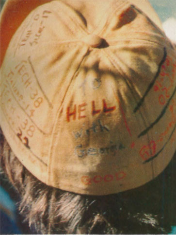 RAT caps are filled out by using a black permanent marker to write the acronym RAT on the upturned brim followed by the student’s name above it, major to the left, graduation year to the right, and hometown and state below. The scores of football games are written on the panels of the cap. If Tech wins, the score should be written right side up, and written upside down if Tech loses. The back panel should contain the phrase “To HELL with georgia” with one word to each line. “HELL” should be written in the largest font and “georgia” should be written in all lowercase letters, as we choose not to recognize U[sic]GA as an institute of higher education. A properly decorated RAT cap serves as a phenomenal souvenir of freshman year.